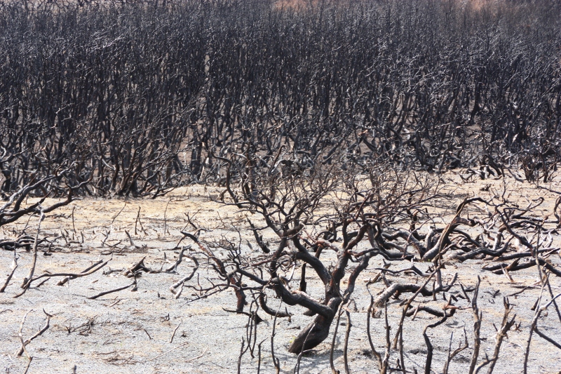 Het is intriest om de verbrande bergen en bossages te zien. Soms toch nog een stukje groen, omdat een weggetje voorkwam dat het vuur verderging. Er wordt trouwens nog steeds geblust, we kwamen een heli tegen die daarna weer water ging halen en blussen…
